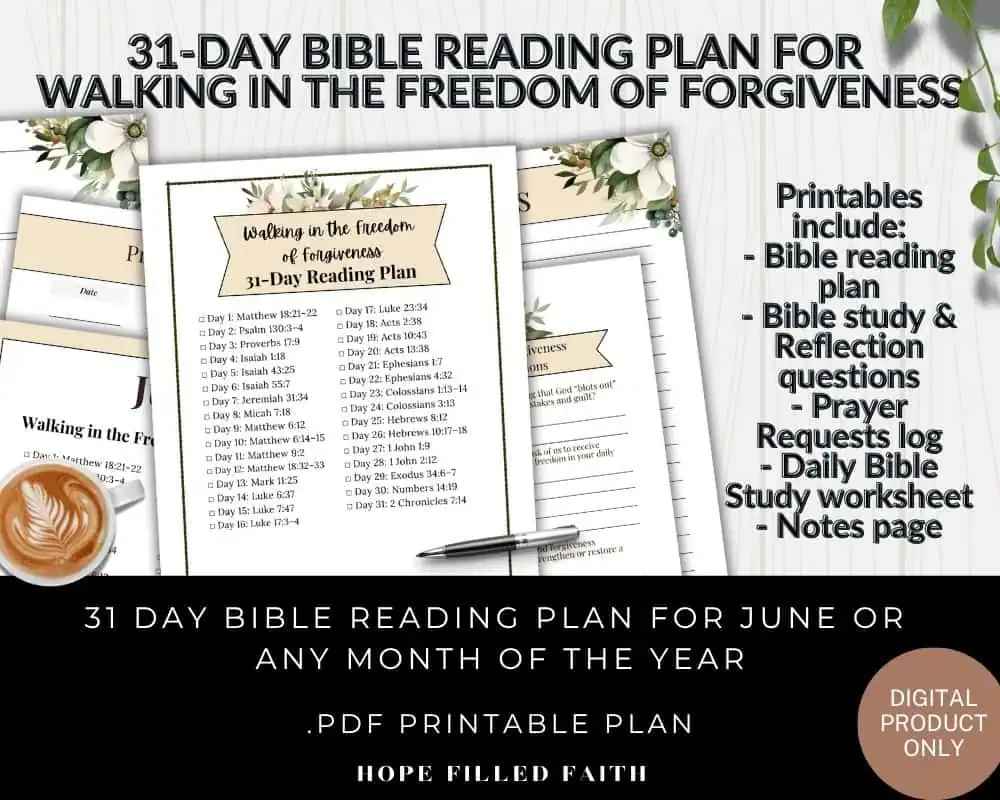You can download the free printable Bible reading plan with these list of Bible verses about forgiving to use in your personal quiet time, or choose the expanded version, which includes a Bible study and reflection worksheet, journaling pages, and a prayer request log designed to help you go deeper each day.